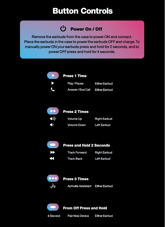 - Remove your Jib™ True 2 earbuds from the charging case and Manually Power them OFF, by touching and holding the button on BOTH buds for 4 seconds