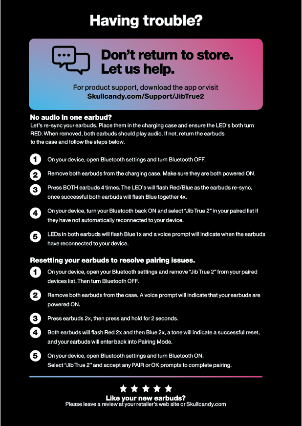 Issue: If you would like to use Jib™ True 2 with only one ear bud (Mono Mode), you’re in luck! The updated technology in Jib™ True 2 allows you to use either the left OR the right bud in Mono Mode. Once paired correctly, you will be able to switch between buds at your discretion. Although, if you’re having any challenges utilizing the Master Role Switching capabilities, you may follow these simple steps to ensure ease of use when pairing and switching between Mono and Stereo Modes.