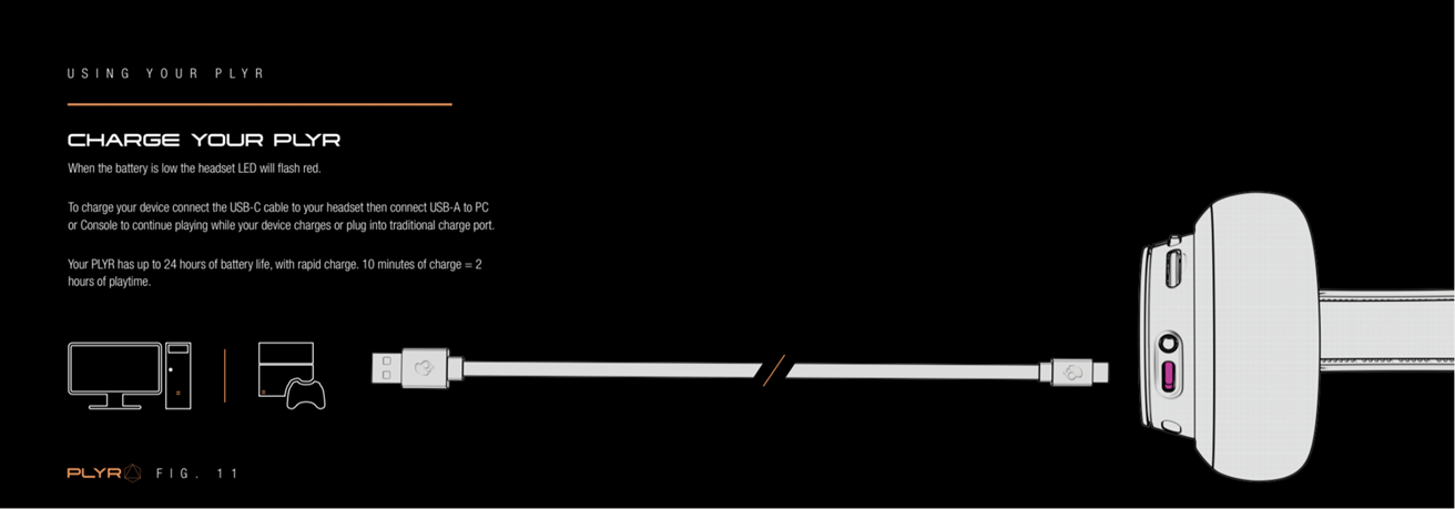 - Yes. Pretty much all USB-A to USB-C charging cables will work to charge your PLYR Headset