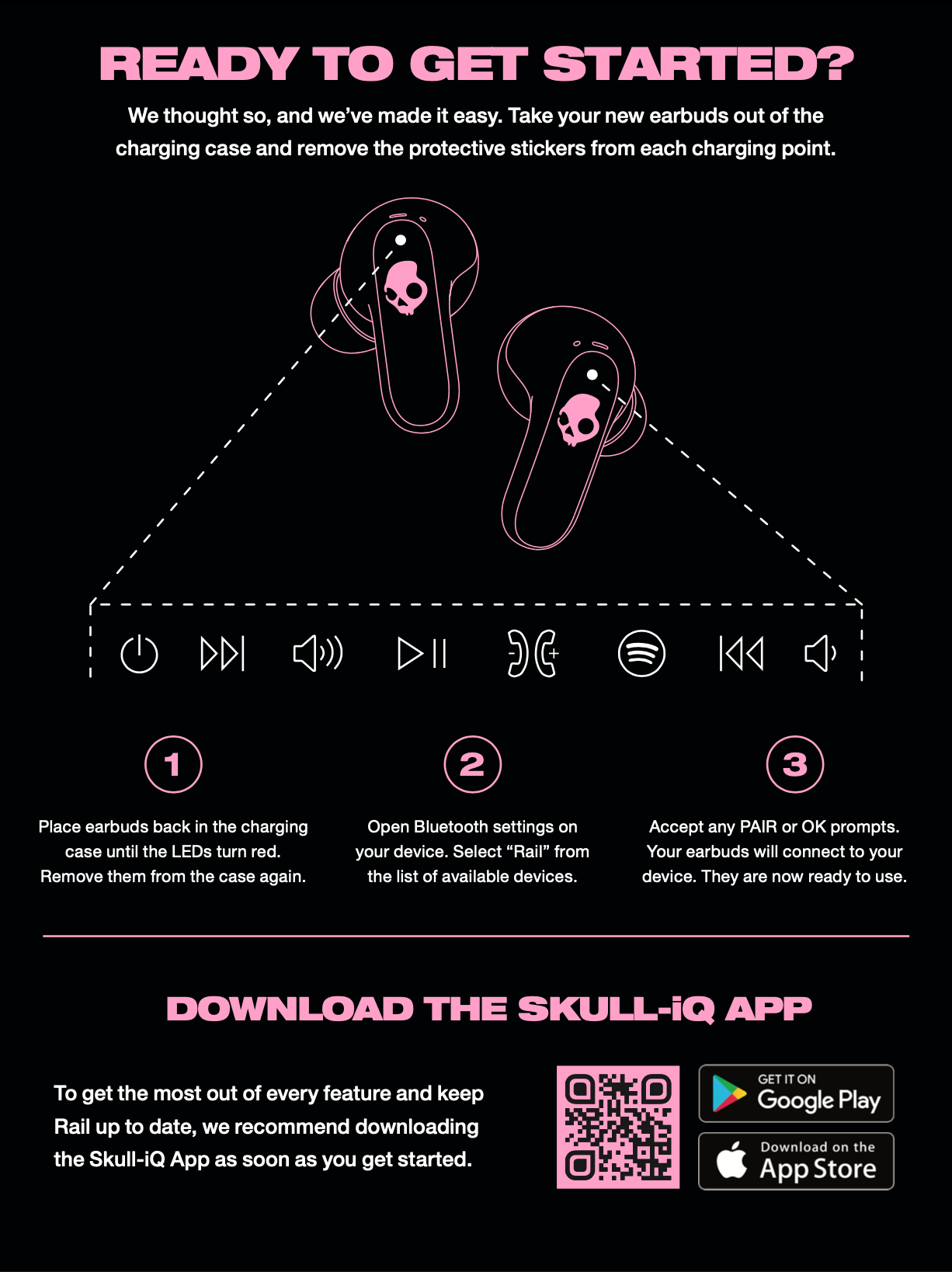 To unlock your earbuds’ Skull-iQ features, scan the QR code in your Quick Start Guide to download the Skull-iQ App.