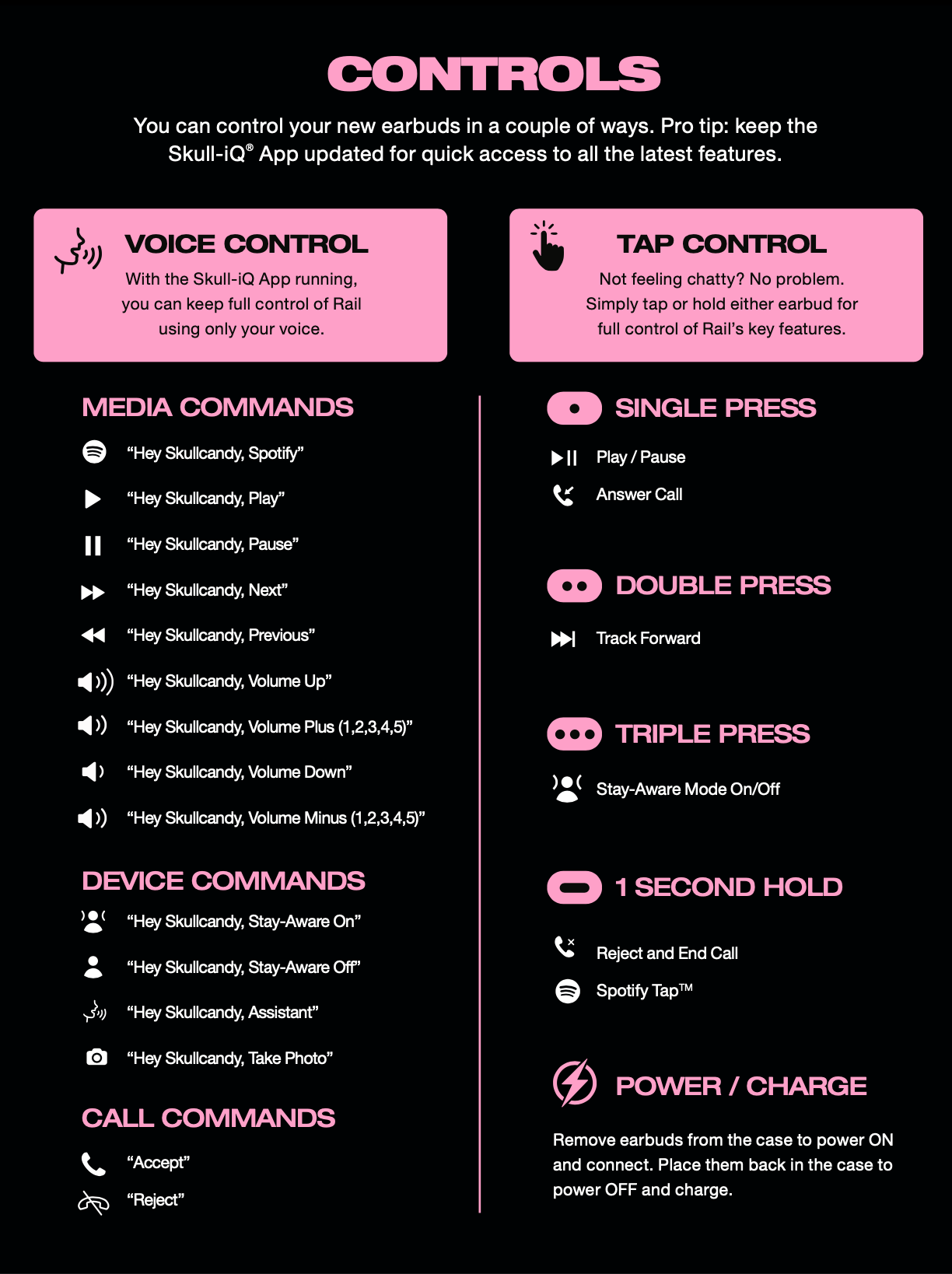 Each time you power ON your earbuds, you will be notified “Voice control ON.” Now you’re ready to issue “Hey, Skullcandy” commands.