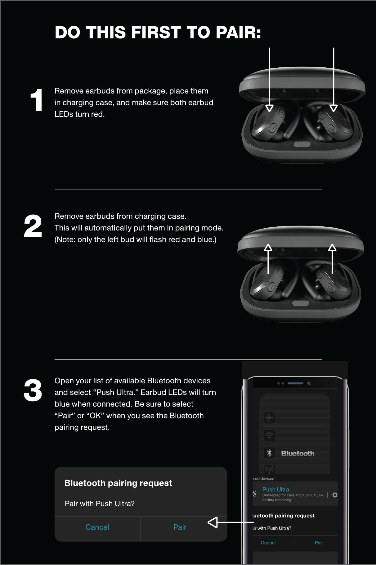 - Remove the PUSH™ ULTRA from the charging case and Manually Power OFF: